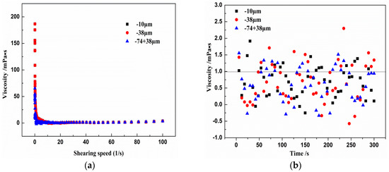 The viscosity results for different size fractions with respect to the conditions of (a) shearing speed and (b) time.