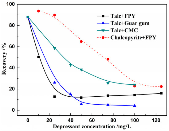 Figure 4 shows the effects of different depressants on the floatability of talc. The results in Figure 4 demonstrated that, compared with CMC and the low dosage of guar gum, the floatability of talc became weaker after adding the FPY depressant at pH = 6.5. It is also indicated that FPY had little depression effect on chalcopyrite, while the talc recovery decreased dramatically with an increase in FPY concentration. In the presence of 25 mg/L FPY, the flotation recovery of talc was about 15%, and the recovery of chalcopyrite was about 90%. The results demonstrated the selective depressive effect of FPY on talc. In addition, the flotation recovery of talc was about 25% with 25 mg/L guar gum. As shown in Figure 4, the results are in accordance with the test by Zhao et al. [41], which reveals that the measurement is reliable. In a word, alternatives could be found to guar gum.