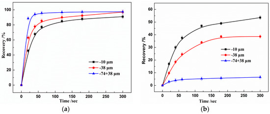 All of the samples were thoroughly equilibrated, and an average recovery value of three individual measurements was recorded for each of the experimental points. Only a small deviation (<2%) was exhibited between the three individual measurement results and the average recovery value. The accumulative recovery results for different size fractions with and without FPY are shown in Figure 5. Table 3 shows the calculated model parameters for the three size fractions of talc. As expressed in Figure 5a, a large portion of the floatable particles is recovered within 1 min. The maximum recovery (t = 5 min) of −74 + 38 μm particles is similar to that of −38 μm particles, above 97%, but both are slightly higher than that of the size fraction −10 μm, 90%. Figure 5b indicates that the obviously suppressed effect is observed for three size fractions after adding FPY, especially for the size fraction of −74 + 38 μm. However, comparatively speaking, the maximum recovery of particle size at −10 μm and −38 μm is higher than that of the size fraction of −74 + 38 μm. Moreover, the recovery difference of size fractions may due to water recovery or entrainment rather than a true flotation via bubble attachment, which can be associated with the small mass and high specific surface area [42]. This issue will be further discussed in the next section.