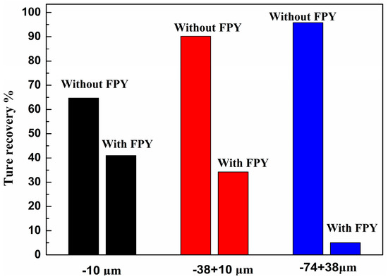 The recovery of true flotation via bubble attachment of the three size fractions in the presence and absence of FPY (25 mg/L, pH = 6.5).