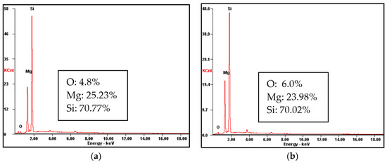 A series of contact angle measurements were carried out to probe the flotation behavior of each particle size fraction as the particle size varied. The advancing contact angle measurement of all size fractions of talc with and without FPY is shown in Table 5. It is indicated that the contact angle obviously decreases as the particle size reduces without any treatment. However, it is not immediately clear whether this variation is due to the intrinsic effects of particle size on the contact angle measurement or due to genuine differences in surface species, as speculated previously [44]. To explore reasons for this variation, a sample of talc particles was prepared without depressant addition. Surface species were analyzed by EDS (Figure 7) before contact angles were measured for each size fraction. It was found that as the contact angle is reduced, either the amount of oxygen increased or magnesium decreases on the surface of talc. The −10 μm size fraction had a lower contact angle due to the higher O and lower Mg content compared to the other size fractions. These results confirm that Mg-containing species are mainly responsible for hydrophobicity in the depressant-less flotation of talc. Thus, while the contact angle varied with particle size fraction (without FPY), the difference in contact angles with particle size is a result of genuine differences in the quantity of O- and Mg-bearing surface species. However, it should be noted that the size of the micro-channels change for the particles of different sizes. So, the change in contact angle can only be partially attributed to the change in surface composition.