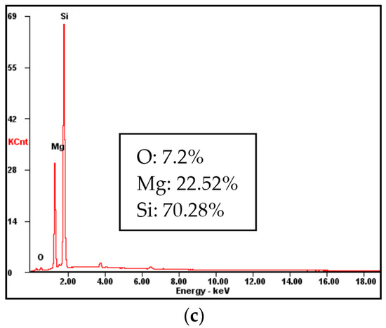 Energy dispersive X-ray spectrometry (EDS) atomic concentrations (wt %) on the surface of talc (without adding FPY) of different size fractions: (a) −74 + 38 μm, (b) −38 μm, (c) −10 μm.