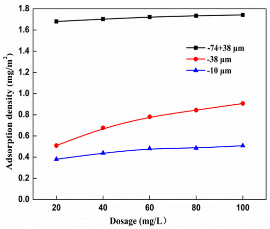 Depressant FPY adsorption results at pH 6.5 for the three size fractions of talc are shown in Figure 8. In contrast to finer particles, such as the −10 μm size fraction, there were large differences between the adsorption densities of FPY on coarse particles at pH 6.5. The adsorption of FPY slightly increased for all size fractions when the dosage of FPY was raised from 10 to 60 mg/L. After the additions of FPY at 25 mg/L, for −10 μm, −38 μm, and −74 + 38 μm talc the adsorption density in the presence of FPY was 0.42 mg/m2, 0.57 mg/m2, and 1.65 mg/m2, respectively. The adsorption density analysis was consistent with the results of the micro-flotation experiments.