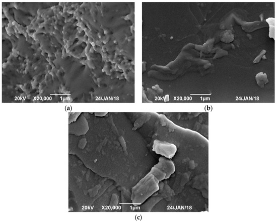 Scanning electron micrographs (secondary electrons), showing FPY adhered onto the surface of (a) −74 + 38 μm, (b) −38 μm, and (c) −10 μm talc particles conditioned with 60 mg/L FPY at pH 6.5.