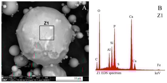 The utilization of an SEM-backscattered electron mode (BSE), however, highlights many morphotypes that are “weird and unique of their kind” from a grey aluminosilicate background due to their average atomic composition, which makes it easier to characterize them, including their chemical composition by EDS (e.g., Ca-rich sphere in Dai et al. [24]; vide figure 5 in [24]). Using these methods, O’Connor, and O’Connor and Meeker [25,26,27] described the abundant occurrence of P, and of Mg–Ca, morphotypes in Wyodak–Anderson coal FA, while Valentim et al. [28] classified P-rich morphotypes in a specific class due to their distinctive petrographic characteristics, and due to the occurrence of a major or secondary P-peak in the EDS spectra.