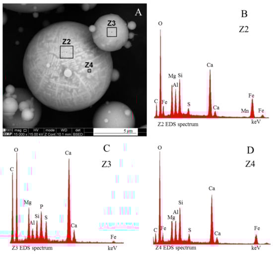 Ca-rich spheres associated with other elements (SEM/EDS BSE mode; 15,000×; Fly ash Polish A6 sample): (A) at center, a ferrosphere having, as seen in (B) Z2 and (D) Z4, a major Ca EDS peak; (B) Z2 dendritic patterns with a clear Fe peak; and (A) Z3 and (C) Z3 indicate a Ca- and Mg-rich phosphosphere.