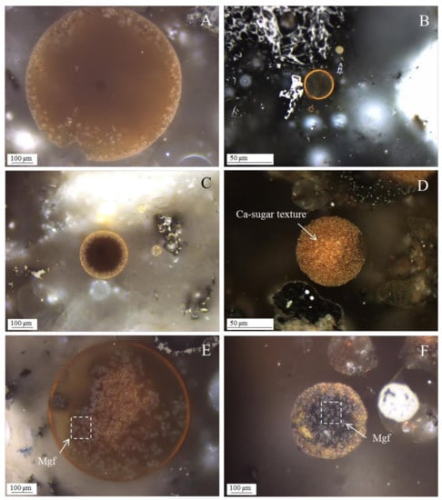 Ca-rich morphotype characteristics under reflected light oil immersion objectives. (A–E) Polish A28 FA sample; F Romanian R4 BA; non-polarized light; (A–C) calcispheres with a yellow rim; (D) calcisphere with an internal golden-yellow sugar texture; and (E,F) Ca-rich morphotypes with dispersed magnesioferrite crystals (Mgf).