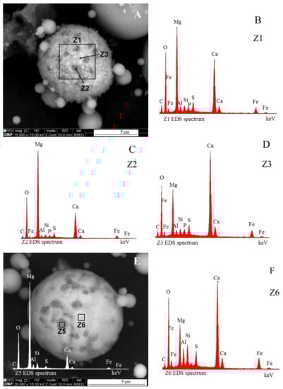 Calcimagnesiasphere, magnesiaferrosphere and magnesiaoxysphere (SEM/EDS BSE mode; Romanian BA: (A,C) sample R24; (E) sample R7): (A) Intermediate brightness morphotypes (200×); (B) EDS spectrum (Z1) of aluminosilicate in (A); (C) calcimagnesiasphere (3000×); (D) magnesiaferrosphere (1750×); and (E,F) magnesiaoxysphere (4000×).