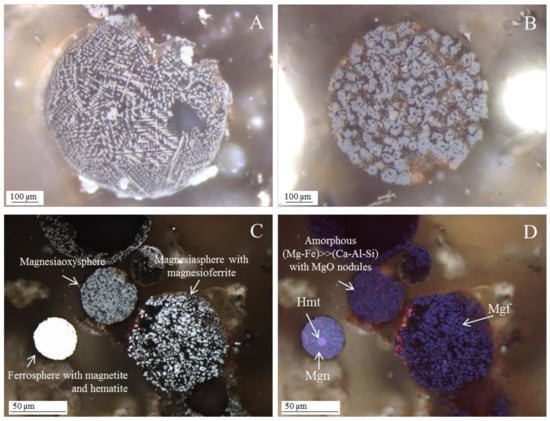 Under reflected light microscopy using oil immersion objectives a set of fundamental differences were also found between calcispheres and magnesiaoxyspheres, and between magnesiaoxyspheres and magnesiaspheres with magnesioferrite. Like magnesiaferrospheres, under the SEM BSE mode, the intermediate brightness between aluminosilicate morphotypes and ferrospheres makes magnesiaoxyspheres relatively easy to find (Figure 13A,B). However, magnesiaoxyspheres have properties between calcimagnesiaspheres and the magnesiaferrospheres (Figure 13C,D).