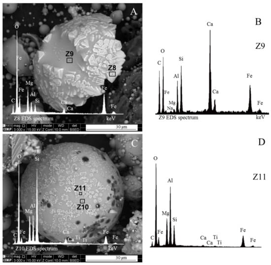 The topography of the “magnesiaspheres” occurring in the studied FA and BA samples show magnesioferrite tetrahedrons embedded in an Al–Si or Ca–Al–Si glassy matrix with high intensity Mg and Fe EDS peaks (Figure 7A: Z8). The Ca concentration in the matrix is highly variable since the EDS spectra may show a major Ca peak or a residual one (Figure 7B: Z9 and Figure 7C: Z10). In some cases, the magnesioferrite crystals may be “skeletal”, i.e., having a major hole inside, which makes their identification less certain unless a high intensity Mg peak is present in the EDS spectrum (Figure 7C,D: Z11).