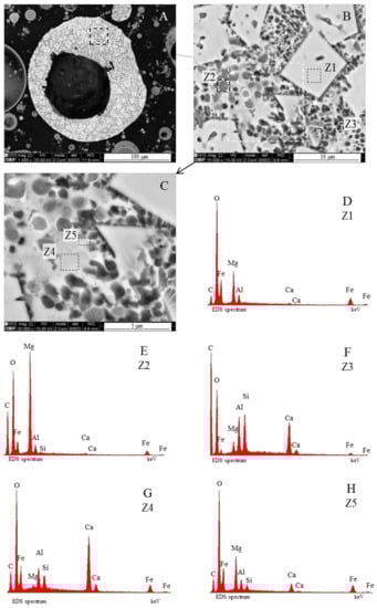 SEM (BSE mode) and X-ray microanalysis (EDS) of a magnesiasphere (fly ash Polish sample A28): (A) Hollow sphere with magnesioferrite crystals (1000×); (B) Magnification of dashed square area in (A), and areas analyzed by EDS (Z1: magnesioferrite crystal; Z2: periclase bleb; Z3: (Ca–Al–Si)·(Mg,Fe)-blebs) (10,000×); (C) Magnification of dashed square area in (B), and areas analyzed by EDS (Z4: Ca-rich material with Fe, Al, Si and residual Mg; Z5: magnesioferrite melt) (20,000×); and (D–H) EDS spectra.