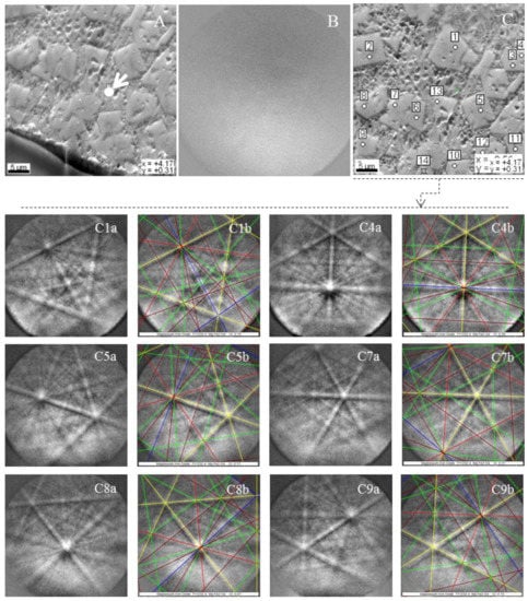 Electron backscattered diffraction (EBSD) analysis of a magnesiasphere section (same as in Figure 8): (A) EBDS analysis outside (white spot in front of the arrow) the euhedral crystals; and (B) no pattern is formed, which is consistent with an amorphous material; (C) EBDS 14 points in euhedral crystals: C1a, C4a, C5a, C7a, C8a and C9a are Kikuchi patterns obtained in points 1, 4, 5, 7, 8, and 9 in (C), respectively, and “b” images the indexation (not signaled) of the Kikuchi patterns, which is consistent with magnesioferrite.