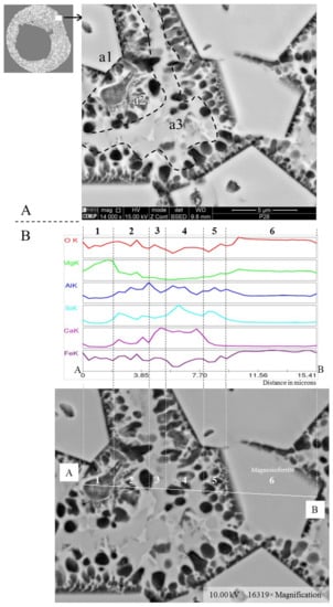 SEM (BSE) and X-ray microanalysis (EDS) of the elemental profile of a section of the magnesiasphere (BSE micrograph: 10.00 kV; ×16,319; (A,B) represent the profile distance = 15.41 µm, 40 points analyzed; atomic orbital K; The colored lines are graphics with variations in intensities of chosen elements: (Red) O, oxygen; (Green) Mg, magnesium; (Blue) Al, aluminum; (Light blue) Si, silicium; (Purple) Ca, calcium; (Dark purple) Fe, iron: (A) Magnesiasphere section constituted by three areas (a1: magnesioferrite crystal; a2: (Mg–Fe)–Al–Si spongy structure with MgO glass; a3: Ca-rich Al–Si); (B) Profile section (1) Mg-rich material with some Fe; Profile section (2) (Al–Si–Fe)-rich dark spots; Profile section (3) Ca-rich material with residual Mg; Profile section (4) (Ca–Si–Al)-rich material with residual Mg; Profile section (5) (Si–Al)-rich material with Fe and Mg, and residual Ca; Profile section (6) Mg– (Fe oxide) crystal (magnesioferrite).