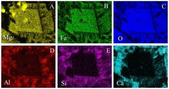 - The euhedral crystal is essentially composed of Mg, Fe, and residual Al. There is an Mg rim near the crystal edge, while the Fe is homogeneously distributed (Figure 11A,B,D).