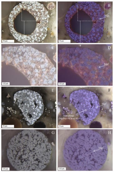Magnesiaspheres (oil immersion reflected white light microscopy; right column: non-polarized; left column: polarized light with 1 λ retarder plate; Polish sample A28): (A–D) hollow magnesiasphere with dispersed magnesioferrite crystals (Mgf); (E,F) fragment of magnesiasphere with magnesioferrite (Mgf) and amorphous Mg–Fe; and (G,H) dense magnesiasphere almost entirely composed of magnesioferrite (Mgf).