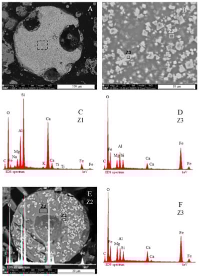 When FA has a medium or high Ca concentration, Ca-rich spheres are a common morphotype, e.g., in Wyodak–Anderson coal FA [27]. However, when the Ca concentration is low, Ca-rich morphotypes are residual (e.g., Dai et al. [24]; vide figure 5 in [24]). Valentim et al. [28] described Ca-rich morphotypes, under the SEM BSE mode, as having a spherical to ellipsoid shape and of being made of an internal spongy texture, naming them calcispheres. This spongy texture (Figure 3) is caused by calcium reactions (e.g., the decomposition of Ca minerals and mass loss [33], and processes of exsolvation of MgO [27]), and also by the formation of Al–Si–Ca nodules (Figure 3C–F).