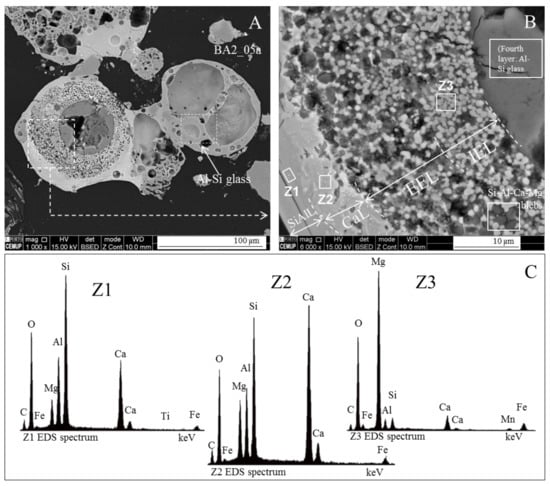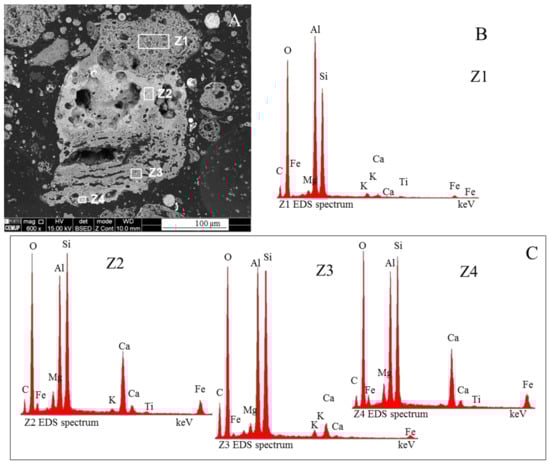 On the mixed calcialuminosilicate morphotypes [Al–Si·Ca(>Mg > Fe)], the distinctive pattern is the alternation of layers with different compositions (Figure 17). In the studied samples, these morphotypes were relatively common, while calcispheres and magnesiaspheres were scarce. These mixed calcialuminosilicate morphotypes show a very irregular shape, and are essentially composed of two distinct alternating layers: dark aluminosilicate layers with small vacuoles, poor in fluxing agents such as Ca, Mg, and Fe (Figure 17A,B: Z1 and Figure 17C: Z3); and light aluminosilicate layers with large vacuoles, and with Ca(>Mg > Fe) (Figure 17A,C: Z2 and Figure 17C: Z4). The characteristics of these morphotypes indicates that they have resulted from larger inorganic particles, e.g., mixed layers of illite–smectite, which either rapidly solidified or were not heated to a high enough temperature for all layers to melt.