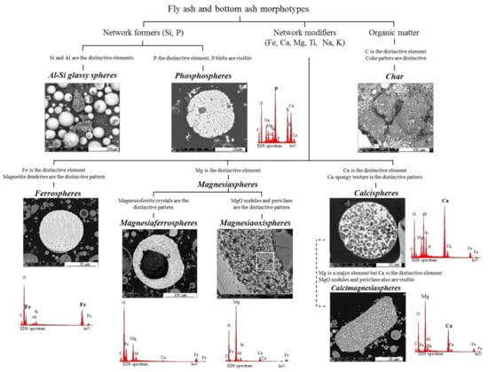 - Network-forming elements Si, P, and C: “Al–Si glass”, “phosphospheres”, and “char”, respectively:Al–Si glass. The most abundant material in fly ash and bottom ash is partially baked clay, and amorphous and glassy aluminosilicate in the form of a vast array of irregular forms and glassy spheres, which reflect both the coal mineralogical composition (in general, mostly clays, carbonates and pyrite) and the combustion conditions, which influence the melt viscosity, trapped volatile matter, surface tension, and cooling rate. The glassy spheres or “Al–Si glassy spheres” are characterized by an aluminosilicate matrix embedding a skeleton of quartz and mullite [17,20,22,47,48,49,50,51];Phosphospheres. These morphotypes are described in Valentim et al. [28], and their “distinctive pattern” is the “pomegranate” texture caused by the phosphorus network;Char. A solid carbonaceous combustion residue—“char” is formed from coal organic matter during the combustion pyrolysis stage inside the furnace, where devolatilization is the main process that occurs and where oxidation is limited. During the oxidation stage, however, not all of the char burns, and coke-like particles composed of a C-rich network are either carried by the gas flow or fall to the furnace bottom, becoming a component of fly ash and bottom ash.The char results from the burning of low, medium and high rank coals with different macerals (vitrinite, inertinite, and liptinite). Therefore, char is a very heterogeneous material and classifications that focused on fly ash while including char were developed (e.g., [2,3]), as were detailed classifications (e.g., [5,23,52,53,54]).
