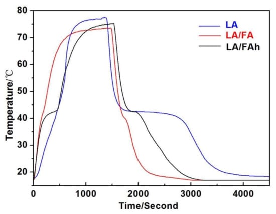 The structure of the samples was analyzed by X-ray diffraction (XRD, DX-2700 diffractometer, Haoyuan, Dandong, China) at a scanning rate of 5°/min with 2θ range from 5° to 80°. Sample morphology was visualized by scanning electron microscopy (SEM, Quanta-200 scanning electron microscope, FEI, Hillsboro, OR, USA) at an acceleration voltage of 5 kV. Differential scanning calorimetry (DSC) analyses were operated using a DSC Q10 instrument at a heating rate of 5 °C/min under a constant stream of argon at atmospheric pressure (accuracies of ±0.10 °C and ±1% for phase change temperature and ΔH capacity, respectively). The sample was cooled in liquid nitrogen during the freezing process. N2 adsorption–desorption isotherms were measured using an ASAP 2020 unit at 77 K, while the materials should be first dehydrated at 200 °C for 10 h. The specific surface area was calculated by the Brunauer–Emmet–Teller (BET) method using the adsorption and desorption isotherms, respectively. The total pore volume was acquired from the maximum amount of N2 adsorbed at partial pressure. According to the generally accepted methods [32,33,34], thermal storage and release tests were performed to investigate the thermal storage/release properties of LA, LA/FA and LA/FAh composites. The samples were, respectively, put into a uniform test tubes. In order to analyze the temperature changes of the samples, one temperature indicator (precision of ±0.10 °C) was placed at the center of each tube. The test tubes were first entered into a thermostat-controlled water bath at the temperature equilibrium of 25 °C, and quickly put into a thermostat-controlled water bath at 80 °C, then put back into a 25 °C water bath until the temperature reached 25 °C.