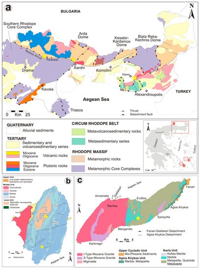 (a) Simplified geological map of eastern Rhodope massif, Greece showing the main tectonic zones and the distribution of Cenozoic igneous rocks (after Melfos and Voudouris [52] and references therein), showing location of corundums at Xanthi, Paranesti and Kassiteres/Sapes areas (stars); (b) Geological map of Naxos island showing locations of sapphires in plumasites at Kinidaros and meta-bauxites at Kavalaris Hill (stars) (after Duchêne et al. [53]; modified after Ottens and Voudouris [54]); (c) Geological map of Ikaria showing the location of blue sapphire in Atsida area (after Beaudoin et al. [55]; modified after Ottens and Voudouris [54]). Yellow stars mark the studied corundum occurrences.