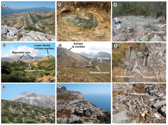 (a) In the central part of the island and about 2 km east and southeast of Kinidaros, two corundum-bearing plumasites (desilicated pegmatites) were studied (Figure 2d–f) [27,29,42]. The meta-peridotites occurred initially as lenses of few to several tens of meters size and are surrounded by phlogopitite, which formed at the contact between the metaperidotites and the intruding pegmatites. Today, most of the plumasites and metaperidotites in these two localities occur as loose fragments mainly due to erosion and agricultural activities in the area.