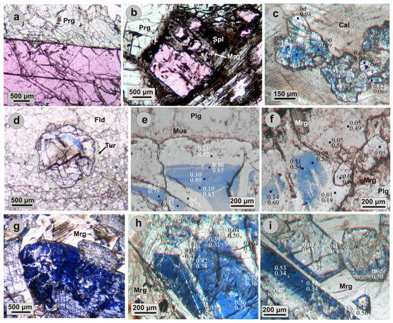 Microphotographs (plane polarized light) demonstrating mineralogical assemblages, color- and chemical zoning of corundum-bearing assemblages from Greece. Values in microphotographs (c,e,f,h,i) correspond to TiO2 and Fe2O3 content in wt. % (upper and lower values, respectively) as obtained by electron probe microanalyses. (a,b) Ruby associated with pargasite (Prg) from Paranesti, Drama area. Note replacement of ruby by spinel (Spl) and margarite (Mrg) in Figure 4b (sample Dr1a); (c) blue to colorless sapphires included in calcite, Xanthi area (sample Go1b); (d,e) Zoned blue to colorless sapphires within anorthite (Plg) and rimmed by tourmaline (Tur) and muscovite (Mus), Kinidaros, Naxos island (sample Nx4); (f) Sapphire with blue core and colorless rim associated with margarite (Mrg) and anorthite (Plg), Kinidaros, Naxos island (sample Nx3); (g) Idiomorphic deep blue colored sapphire crystals surrounded by margarite, Ikaria island (sample Ik1b); (h,i) Zoned blue to colorless idiomorphic sapphires, surrounded by margarite, Ikaria island (sample Ik2).
