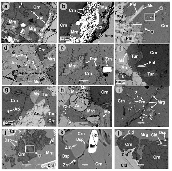 Microphotographs (SEM-BSE images) demonstrating mineralogical assemblages of corundum-bearing assemblages from Greece. (a,b) Ruby (Crn) including and rimmed by chromian spinel (Spl), margarite (Mrg), muscovite (Mu), chlorite (Chl) and pargasitic hornblende (Amp) (sample Dr1, Paranesti/Drama); (c,d) Blue sapphire (Crn) in association with anorthite (An) and phlogopite (Phl) replaced by muscovite (Mus), margarite (Mrg), and oligoclase (Olg) (Naxos island, sample Nx1); (e) Zircon (Zrn) is included in sapphire, diaspore (Dsp) and margarite (Mrg) fill fractures and are retrograde minerals. Naxos island, sample Nx1); (f,g) Blue sapphire including phlogopite and fluorite (Fl) is associated with anorthite (An) and replaced by tourmaline (Tur) and muscovite (Mus) (Naxos island, sample Nx4); (h) Blue sapphire and anorthite are rimmed by muscovite, margarite and chlorite (Chl) the late probably replacing phlogopite (Naxos island, sample Nx4a); (i) Blue sapphire including zircon is replaced by margarite (Naxos island, sample Nx4a); (j–l) Blue sapphire associated with margarite includes and replaces chloritoid (Cld) and are retrogressed to diaspore and chlorite, respectively. Zircon and Ilmenite (Ilm), rutile (Rt) are included in corundum (Ikaria island, sample Ik2).