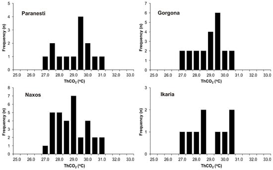 Histograms of homogenization temperatures of CO2 (ThCO2) to the liquid phase (LCO2) in the fluid inclusion from the Rhodope massif (Paranetsi, Gorgona) and the Attic-Cycladic massif (Naxos, Ikaria) from Greece.