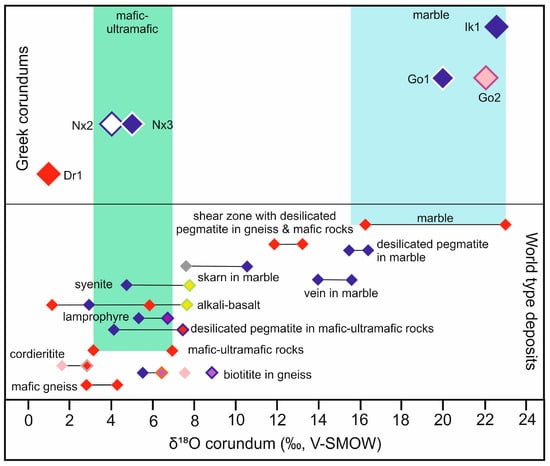 Oxygen isotopic composition of Greek corundum (after Wang et al. [83]) compared with the oxygen isotopic ranges from corundum deposits worldwide from the data of Giuliani et al. [2,7,14,81,82]. Color in diamonds represents the color of the studied corundums. Colorless sapphires are represented by white diamonds.