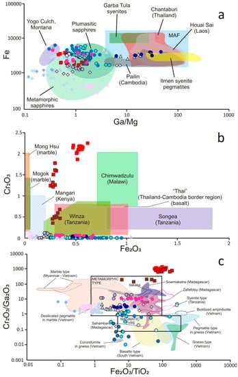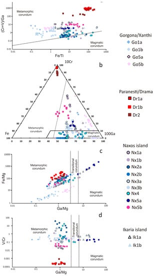 Chromophore and genetic indicator elements (Fe, Cr, Ti, V, Ga and Mg) are commonly used to distinguish corundum from different primary sources using elemental diagrams [16,84,85,86,87,88]. In the (Cr + V)/Ga versus Fe/Ti diagram (Figure 9a, [84,85]), displaying the fields for metamorphic and magmatic corundums, the majority of the samples plot in the field of metamorphic corundum, exhibiting a large variation of Fe/Ti ratios. Some sapphires from Naxos island that plot in the magmatic field have very low Cr/Ga ratios. Rubies from Paranesti/Drama show high Cr/Ga and Fe/Ti ratios, followed by the pink and purple sapphires from Naxos island. Both colorless to blue and pink sapphires from Gorgona/Xanthi and blue sapphires from Ikaria island are characterized by relatively fixed Cr/Ga, but display variations with respect to their Fe/Ti ratios.