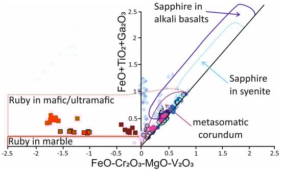 In the (FeO–Cr2O3–MgO–V2O3) versus (FeO + TiO2 + Ga2O3) diagram after Giuliani et al. [87,88], which further differentiates the metamorphic environments (Figure 10), all rubies from Paranesti/Drama clearly fall in the field of rubies with mafic/ultramafic origin. Pink sapphires from Gorgona/Xanthi, plot in an overlapping area between the marble-hosted rubies and the metasomatic corundum fields, while the rest of sapphires from this locality, which are colorless to blue in color, plot in a linear trend along the y axis of the diagram, indicating variable contents of Fe, Ti and Ga. The rest of the studied samples (Naxos and Ikaria sapphires) plot mostly in the field of metasomatic corundum, with some analyses plotting in the borders with the field of syenite-related sapphires. In general, the trends observed in Figure 9 and Figure 10 reflect variations in chromophore element concentrations, even in samples from the same locality. This could be attributed to changes in chemistry and physicochemical conditions of the corundum-forming environment, perhaps due to metasomatic processes as described by Harris et al. [85].