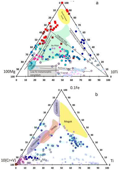 Rubies and sapphires, the two different varieties of the mineral corundum, are among the most popular gemstones used in jewelry. The color in corundum varies from brown, pink to pigeon-blood-red, orange, yellow, green, blue, violet etc. The main chromophore trace elements in corundum are Cr, Fe, Ti and V. Cr3+ produces pink and red, while Fe2+–Ti4+ pairs produce blue. Distinction of primary gem quality-rubies and sapphires in magmatic and metamorphic is mainly based on the classification schemes presented by Garnier et al. [1], Giuliani et al. [2] and Simonet et al. [3]. Corundum deposits were mainly formed in three periods, the Pan-African orogeny (750–450 Ma), the Himalayan orogeny (45–5 Ma) and the Cenozoic continental rifting with related alkali basalt volcanism (65–1 Ma) [2,4,5,6,7,8,9,10]. Magmatic and metamorphic ruby and sapphire deposits related to the Pan-African orogeny are present in southern Madagascar, East Africa, South India and Sri Lanka; those related to the Himalayan orogeny mostly occur in marbles from Central and Southeast Asia. Alkali basalt-related sapphires occur in Australia, northern and central Madagascar, Nigeria, Cameroon, French Massif Central and southeast Asia.