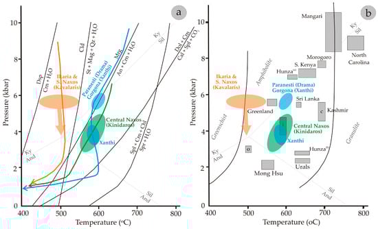 - Buick, I.S.; Holland, T.J.B. The P-T path associated with crustal extension, Naxos, Cyclades, Greece. In Evolution on Metamorphic Belts; Daly, J.S., Cliff, R.A., Yardley, B.W.D., Eds.; Geological Society Special Publications: Lomdon, UK, 1989; Volume 43, pp. 365–369. [Google Scholar]