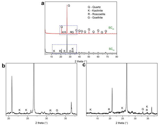The study of petrography is useful for the identification of rocks, minerals, and ores [38,45]. The reflected light microscopy images demonstrated that four types of mineral phases were easily distinguished in two samples (Figure 4). The optical characteristic of roscoelite is that the ⊥ Bxa interferogram can be seen on the (001) plane, and the irregular roscoelite particles were surrounded by quartz. According to the optical characteristic of roscoelite, the dark roscoelite contains Fe impurities or carbonaceous impurities (Figure 4b,c). Goethite was distributed in kaolinite in a wide range of sizes. Kaolinite is mainly distributed along the bedding planes and, to a lesser extent, occurs as disseminated fine particles (Figure 4a,d) [8]. Therefore, the mineralography compositions of these samples were quartz, kaolinite, goethite, and roscoelite. However, the amount and size of roscoelite in SCwt was slightly larger than in SChc, and the brownish-yellow area was also significantly larger than in SChc. These results were in accord with the XRF and XRD results.