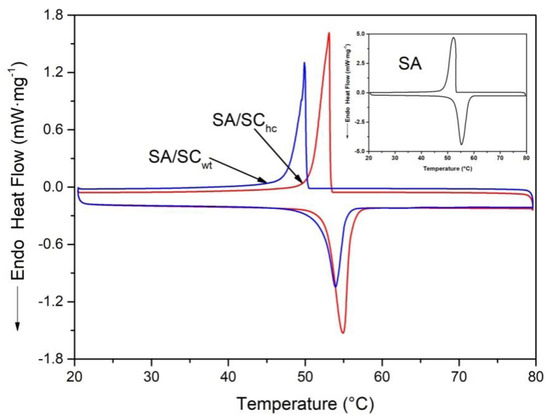DSC curves of pure stearic acid (SA), SA/SCwt, and SA/SChc.