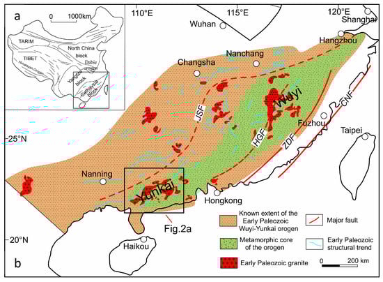 (a) Geological map of China (modified after [46]). (b) Simplified regional map with highlighted regions showing the Early Paleozoic Wuyi–Yunkai orogen; JSF = Jiangshan–Shaoxing fault; HGF = Heyuan–Guangfeng fault; ZDF = Zhenghe–Dapu fault; CNF = Changle–Nanao fault (modified after [30,31,41,47]).
