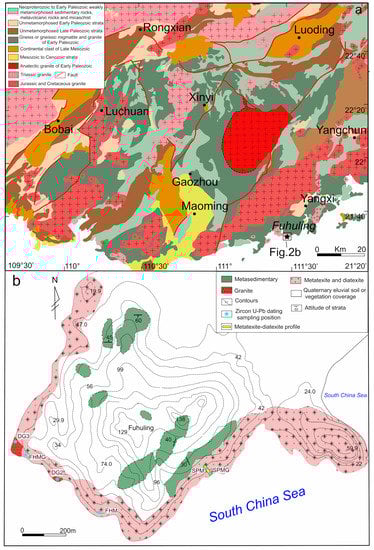 (a) Geological map of the Yunkai region (modified after [31,41]). (b) Geological map of Fuhuling with the metatexite–diatexite profile and sampling locations for U-Pb zircon geochronology.