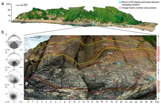 Profile of the Fuhuling metatexite–diatexite transition. (a) 3D image of the beach at the southeast of Fuhuling taken by an unmanned aerial vehicle. The location of the metatexite–diatexite profile is marked by the black dashed line box, and the sampling positions for zircon U-Pb geochronology are marked by stars. (b) Metatexite–diatexite profile in which the yellow and red dashed lines are boundaries between layer I, layer II, layer III, and layer IV. Red boxes mark the position of leucosome proportion measurements and are numbered by Ffm1–12. Stars mark the positionsof samples for zircon U-Pb geochronology. ①, ②, ③, and ④ on the left are the layer I, II, III, and IV stereonets of structural data, which show changes in leucosome orientations from metatexite to diatexite. Kamb contours of the structural data are shown with 2σ contour intervals. The software Stereonet version 6.3.3 by Richard Allmendinger was used for the equal-area stereographic projections. (http://www.geo.cornell.edu/geology/faculty/RWA/programs.html).