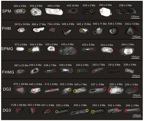 Representative cathodoluminescence (CL) images of analyzed zircons from metatexite samples (SPM, FHM), diatexite samples (SPMG, FHMG), and biotite monzogranite samples (DG2, DG3) samples in Fuhuling. Red circles show LA-ICPMS dating spots in inherited zircon of discordance values <10%, metamorphic zircon and magmatic zircon of discordance values <5%, and corresponding U-Pb ages. Yellow circles show LA-ICPMS dating spots in metamorphic zircon and magmatic zircon of discordance values >5%.