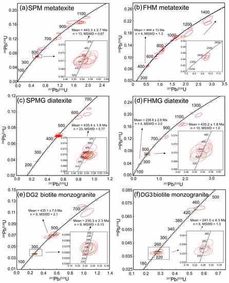 Zircon LA-ICPMS U-Pb concordia diagrams for the samples of Fuhuling with uncertainties on the weighted-mean ages are reported at 2σ. (a) metatexite sample (SPM) and discussed zircon spots. (b) metatexite sample (FHM) and discussed zircon rims. (c) diatexite sample (SPMG) and discussed zircon spots. (d) diatexite sample (FHMG) and discussed zircon spots. (e) biotite monzogranite sample (DG2) and discussed zircon spots. (f) biotite monzogranite sample (DG2) and discussed zircon spots. See the text for a detailed explanation.