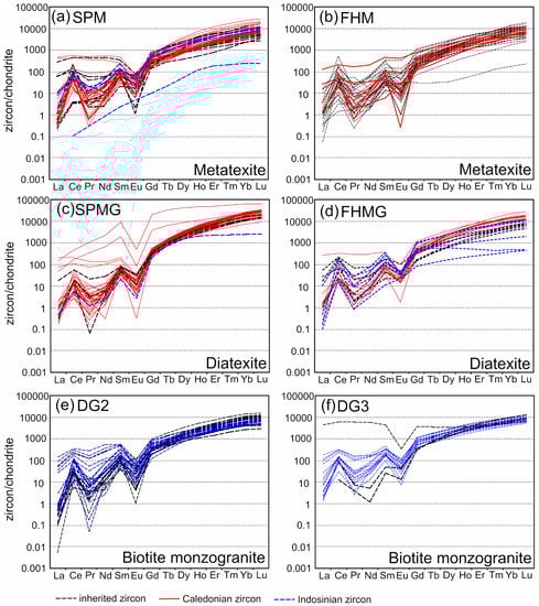 Chondrite-normalized REE patterns of zircons from samples of Fuhuling. (a) metatexite sample (SPM). (b) metatexite sample (FHM). (c) diatexite sample (SPMG). (d) diatexite sample (FHMG). (e) biotite monzogranite sample (DG2). (f) biotite monzogranite sample (DG3). The black dotted line represents the inherited zircon cores, the red line represents the early Paleozoic zircon and the blue dotted line represents the Indosinianzircon. Chondrite values are from [58].