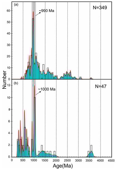 Histograms (blue boxes) and probability distribution functions (red lines) for (a) detrital zircons from metasedimentary rocks of Yunkai region and (b) inherited zircons from metatexite and diatexite from this study. Data source: Yunkai Group two-mica gneiss and quartz-mica schist [36]; gneiss from Luoding [64]; paragneiss from Xiejie [29]; biotite plagioclase gneiss from Xinyi [65]; and metamorphic feldspar quartz-sandstone from Luola Village, southwest of Luoding, and biotite gneiss from the east of Xinyi [42].