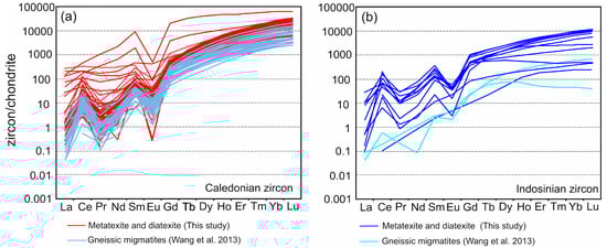 Comparison of chondrite-normalized REE patterns of (a) Caledonian zircon and (b) Indosinian zircon from this study and from [30]. Chondrite values are from [58].