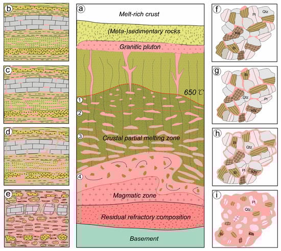Model of the evolution of the “mixture” composed of partially molten rocks and melt in the Fuhuling during partial melting. (a) Partial melting zones of melt-rich crust. Four crustal partial melting zones correspond to the melt fractions of 0–7 vol.%, 7–21 vol.%, 21–40 vol.%, and >40 vol.%. Metatexite formed in crustal zones (1)–(3), while diatexite formed in crustal zone (4), and as the partial melting proceeds, granite will eventually form. The 650 °C isotherm approximates the wet solidus of crustal rocks. (b–e) Macrostructural sketches of the “mixture” composed of partiallymolten rocks and melt, illustrating the rheological transitions due to changesin the melt fraction when going through the processes of melt production, melt segregation, melt migration, and melt redistribution, which correspond to the melt fractions of 0–7 vol.%, 7–21 vol.%, 21–40 vol.%, and >40 vol.%, respectively (pink = melt, gray or yellow blocks = (meta)sedimentary rocks) (modified after [11,24]). (f–i) Microstructural sketches illustrating the evolution of the melt/solid two-phase system during partial melting corresponding to the melt fractions of 0–7 vol.%, 7–21 vol.%, 21–40 vol.%, and >40 vol.%, respectively (pink = melt, Qtz = quartz; Kfs = K-feldspar; Pl = plagioclase; Bt = biotite).