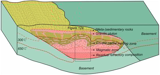 If partial melting proceeds and melt cannot be effectively drained, the accumulation of melt and settling of partiallymolten residuum will lead to the transition from a “mixture”—composed of the partially molten protolith and melt—to magmas that may ascend to form granite plutons [11] or remain in the anatectic crust. In the Yunkai region, Early Paleozoic migmatites and granites are considered to have a genetic link because of the synchronicity between crustal partial melting and magmatism [30,31,32]. Current geodynamic models of the Wuyi–Yunkai orogeny include crustal partial melting (anatexis) during the Early Paleozoic [29,31,77], but the rheological effects of a melt-rich crust on this intraplate orogen are unclear.During orogenesis, partial melting of the crust is heterogeneous given the variable fertilities of different lithologies [94]. If the crust incorporates large quantities of fertile (meta)sedimentary rocks, it may be able to generate voluminous anatectic melt [15,85]. In contrast to the fluid-present melting documented at Fuhuling, anhydrous peritectic minerals associated with higher-temperature hydrate-breakdown melting are present elsewhere in the Yunkai region [31]. The preservation of anhydrous peritectic minerals in anatectic rocks requires the loss of anatectic melt [95] and leaves behind a more refractory residue that is expected to be stronger than the unmelted protolith [96]. This contrasts with the large amount of leucosome observed at Fuhuling, which suggests substantial melt retention and possible melt accumulation. Consequently, the Yunkai region may represent a section through a heterogeneous crust with both melt-rich (weak) and melt-poor (strong) horizons, and this suggests that partial melting of the crust and the amount of melt in different crustal horizons was heterogeneous during the Wuyi–Yunkai orogeny (Figure 13).