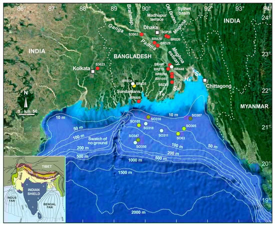 The Ganga–Brahmaputra delta lies on an active plate-boundary and sits on the continent-ocean transition at the northern edge of the Indian plate, which is subducting under the Himalaya in the north and under the Tripura (Indo-Burman) fold-belt in the east ([,]). The delta has thus long been subjected to strong tectonic subsidence, which has determined an accumulation of ~16 km of orogenic sediment since Paleocene collision between India and Asia ([,,]). Despite continuing subsidence ([]; Figure 9 in []), huge sediment supply was sufficient to halt transgression during rapid sea-level rise in the early Holocene, and to initiate deltaic progradation at rates notably higher than most other deltas worldwide since ~11 ka, leading to seaward coastal advance by 100–300 km over a 250 km wide front after maximum sea level was reached at 8–7 ka ([]). In the last 6–5 ka, the lower delta plain west of the modern estuary was deposited as a Ganga-dominated delta, whereas Brahmaputra influence remained confined to the eastern area of the Meghna estuary and to the supratidal part of the delta (Figure 13 in []; Figure 9 in []). Active sedimentation has continued until today in the estuary area, where on average 7 km2 of new land have been added each year since 1792 (4.4 km2/a since 1840) while the inactive western delta was undergoing tidal reworking and net erosion with as much as 3–4 km of shoreline retreat ([]; Figure 2b in []).