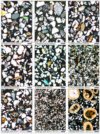 In this section, we illustrate the petrographic, heavy-mineral, and geochemical data newly obtained on Meghna estuary and Bengal shelf sands.