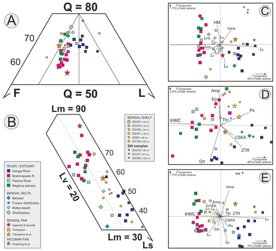 Petrography and heavy minerals in the Bengal sediment system (data for Ganga– Brahmaputra sand and Bengal shelf mud after [,]; data for Bengal–Nicobar Fan turbidites after [,,,]). Although detrital modes are controlled by several factors including seasonal and annual variability, hydraulic sorting, and grain size, litho-feldspatho-quartzose Brahmaputra sand is discriminated from mostly feldspatho-litho-quartzose Ganga sand in QFL (A) and LmLvLs (B) triangular diagrams, as well as in biplots ((C) petrography; (D) heavy minerals; (E) petrography and heavy minerals combined). Padma River and Meghna estuary sands range from almost pure Brahmaputra to mixed Ganga–Brahmaputra, whereas sediments of the subaerial delta are akin to the Ganga in the west and to the Brahmaputra in the east. Bengal shelf and fan sediments are either intermediate or close to the Brahmaputra. See Section 3 for an explanation of the biplot (drawn using CoDaPack software by []). Petrographic and mineralogical parameters are as in Table 1.
