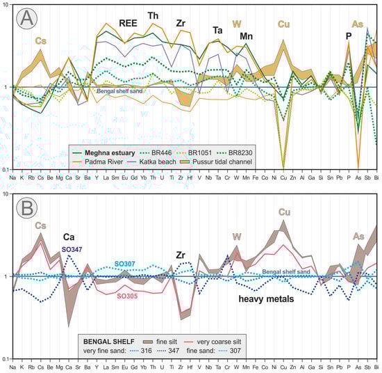 The joint inspection of Figure 4A,B reveals another aspect of hydraulic control on the compositional variability of Bengal Shelf sediments associated with either selective winnowing or settling of clay. The analyzed shelf sands display higher concentrations than fluvial and estuarine bedload in heavy metals and elements such as Cs and As, largely adsorbed on clay or associated with oxy-hydroxides and organic matter (e.g., [,,]). The concentration of these elements is even markedly higher in tidal muds of the Pussur distributary channel, and highest in fine silt of distal foresets and bottomsets of the subaqueous delta.