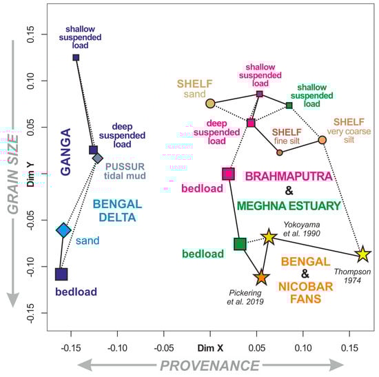 Multidimensional scaling map based on heavy-mineral data (plotted using the “provenance” package of []). The distance among samples is approximately proportional to the Kolmogorov–Smirnov dissimilarity of their tHM suites. Solid and dashed lines link closest and second-closest neighbors, respectively; the “stress” value of the configuration is 5.4, indicating a “good” fit ([]). Samples are separated chiefly by grain size along the y-dimension and by provenance along the x-dimension, which highlights the Ganga affinity of subaerial Bengal delta sediments, and the Brahmaputra affinity of Meghna estuary, Bengal shelf, and Bengal Fan sediments. As in Figure 3D, Brahmaputra affinity of estuary, shelf, and fan sediments partly reflects the higher heavy-mineral concentration in Brahmaputra than in Ganga sediments.